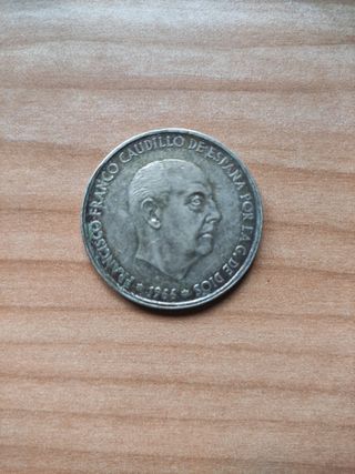 Moneda de 1 peseta española del año 1966. - Anverso: Retrato de Francisco Franco. - Reverso: Escudo de España. - Inscripción: FRANCISCO FRANCO CAUDILLO DE ESPAÑA POR LA G. DE DIOS 1966.