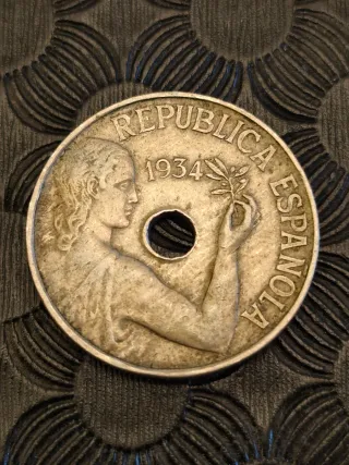 Moneda de 25 céntimos de la Segunda República Española del año 1934. Presenta un diseño circular con un agujero en el centro. - Ceca: España - Año: 1934 - Denominación: 25 Céntimos - Emisor: Segunda República Española