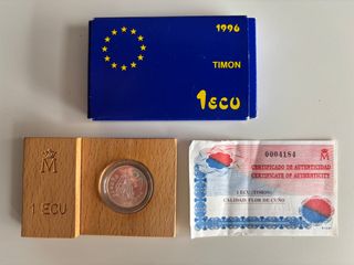 Moneda conmemorativa de 1 ECU de 1996, perteneciente a la Marina Española. Presentada en un soporte de madera. - Material: Plata. - Acabado: Proof. - Año: 1996. - Denominación: 1 ECU. - Temática: Marina Española.