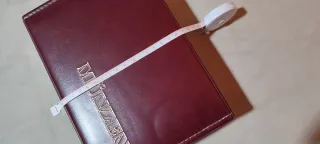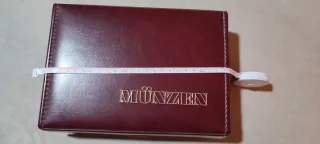 Elegante estuche de piel para coleccionar y guardar monedas. - Interior forrado en terciopelo burdeos. - Compartimentos individuales para monedas. - Diseño con escudo grabado en la tapa superior. - Cierre metálico.