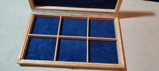 Estuche de madera con compartimentos forrados en fieltro azul, ideal para organizar y proteger monedas. - Interior con 6 divisiones. - Forro de fieltro azul. - Tapa con bisagras.