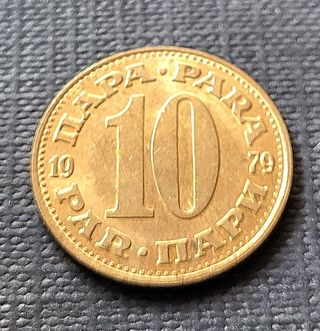 Moneda de 10 Para de Yugoslavia, acuñada en 1979. - Diseño con el número 10 en el centro. - Inscripción 10 PARA y SFRJ en serbocroata. Asia, Africa, America, Europa, Oceania Mas monedas y billetes en mi perfil Hago envios de diferentes tipos