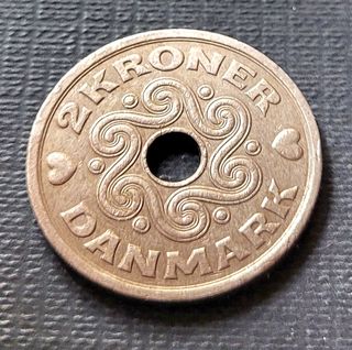 Moneda de 2 Kroner de Dinamarca, año 1994. Presenta un diseño con un agujero central y motivos ornamentales. - Diseño con espirales y corazones. - Inscripción DANMARK y 2 KRONER. Asia, Africa, America, Europa, Oceania Mas monedas y billetes en mi perfil Hago envios de diferentes tipos