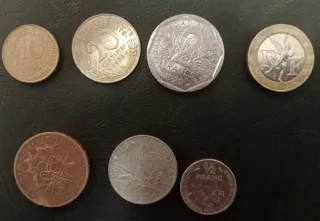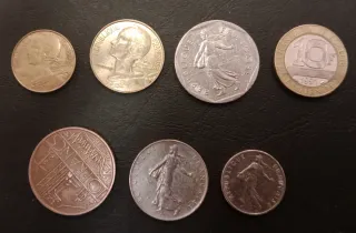 Conjunto de monedas francesas de diferentes valores y años. - Incluye monedas de 1 Franco. - Incluye monedas de 5 Francos. - Incluye monedas de 10 Francos. - Incluye monedas de 2 Francos. - Algunas monedas muestran la figura de Marianne. - Otras monedas presentan motivos florales o arquitectónicos.