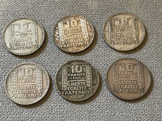 Conjunto de seis monedas de plata de 10 francos franceses, acuñadas en la década de 1930. - Monedas de 10 Francos. - Años: 1930, 1931, 1932, 1933, 1934, 1938. - Diseño con espigas de trigo y lema Liberté, Égalité, Fraternité.