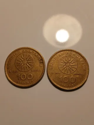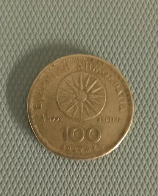 moneda griega de 100 dramas de 1990, cara y brújula con una especie de sol o brújula