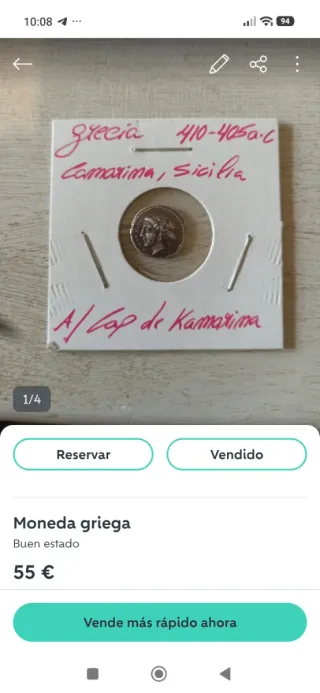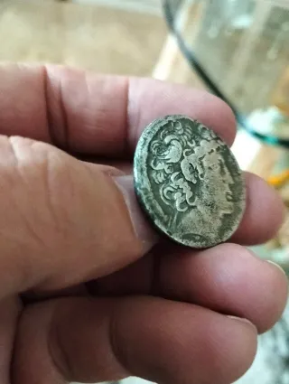 Moneda antigua de origen griego. Presenta un perfil de una figura con tocado. - Diseño detallado. - Material metálico. Escucho ofertas.