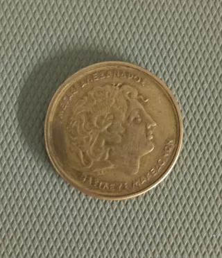 Moneda de Grecia con un diseño clásico. - Grabado de un perfil. - Inscripción en griego.