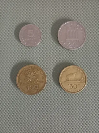 Conjunto de cuatro monedas de Dracmas griegos. - Moneda de 5 Dracmas de 1982. - Moneda de 20 Dracmas de 1986. - Moneda de 100 Dracmas de 1992. - Moneda de 50 Dracmas de 1986.