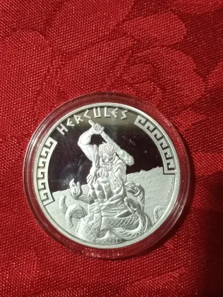 Moneda de plata conmemorativa de Hércules luchando contra una serpiente. Diseño detallado y acabado brillante. - Plata de ley 9999. - Diseño de Hércules y la serpiente. - Borde con patrón griego.