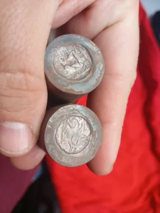 Conjunto de dos cuños antiguos de bronce. Conjunto de dos cuños de bronc compuestos de cara de anverso y reverso para hacer monedas íberas en cobre o otros materiales para monedas obolos griegos, oportunidad para personas que quieran usarlas con fines didacticos, enseñar en talleres medievales como se hacian monedas antiguamente, etc... Estan en mal estado, muy desgastados, son de bronce, como se puede ver en las fotos.