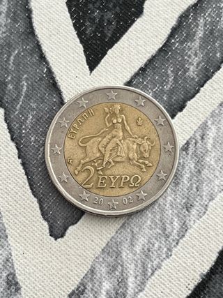 Moneda de 2 euros conmemorativa de Grecia del año 2002. El diseño muestra el rapto de Europa, con Zeus transformado en Zeus. - Acuñada en 2002. - Marca de una “S” en una de las estrellas que rodean la ilustración. - Canto con escritura en griego.