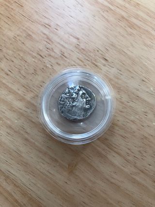Preciosa reproducción artesanal de esta moneda griega de Alejandro Magno. Fabricada en Plata de Ley 925 Precio fijo Solo hacemos envíos Si estás interesado en varias unidades, coméntanoslo.