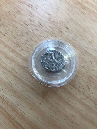 Preciosa moneda antigua de colección. Se trata de una reproducción de una tetradracma ateniense. - Moneda de metal con detalles cuidados. - Incluye estuche original. - Perfecta para coleccionistas.