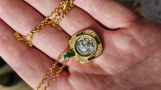 MONEDA ANTIGUA GRIEGA EN COLGANTE DORADO CON PIEDRAS + CADENA GRATIS. Se trata de una reproduccion.
