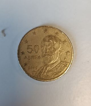 Moneda de 50 lepta de Grecia, año 2002. Moneda difícil de conseguir con el retrato de Eleftherios Venizelos, un destacado estadista griego y una figura clave en la modernización del país. Su nombre "Ελ. Βενιζέλος" se encuentra escrito en la moneda.