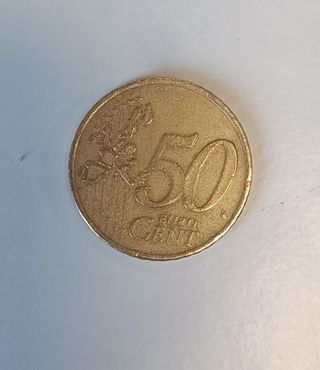 Moneda 50 céntimos fabricada en Grecia en el año 2002.Se trata de un ejemplar que ya no se encuentra en circulación y tiene más de 20 años. Tiene una F en una de las estrellas.