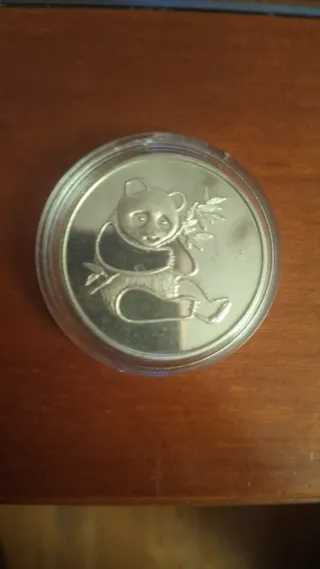 Moneda con diseño de panda internacional.plata 0.999EE.UU Venta en mano - Detalle de panda comiendo bambú PESO 1ONZAE.