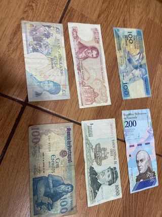 Conjunto de billetes de colección de diferentes países. - Billete de 5 Libras del Banco de Inglaterra. - Billete de 100 Dracmas de Grecia. - Billete de 100 Escudos de Portugal. - Billete de 1000 Pesos de Chile. - Billete de 200 Bolívares de Venezuela.