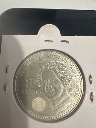 Moneda conmemorativa de 20 euros dedicada al Centenario del Día Internacional de la Mujer. - Conmemora a Clara Campoamor (1911-2011). - Diseño con retrato de Clara Campoamor. - Valor nominal de 20 euros.