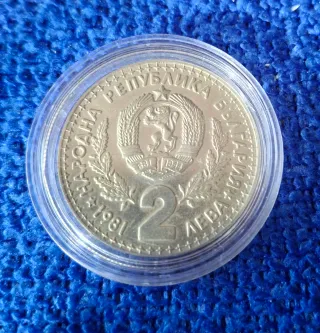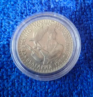 Moneda conmemorativa de Bulgaria del año 1981. Dedicada a la exposición internacional de la caza Valor 2 leva - Diseño con un hombre y un águila. - Inscripción БЪЛГАРИЯ 1981 y СВЕТОВНО ЛОВНО ИЗЛОЖЕНИЕ.