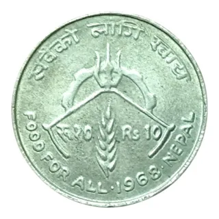 PLATA La moneda conmemorativa emitida en Nepal en 1968 con el lema “Food for All” fue acuñada como parte de la campaña internacional promovida por la FAO para concienciar sobre la lucha contra el hambre y la necesidad de asegurar alimentos para toda la población mundial. Esta emisión refleja un periodo de cooperación global en el que numerosos países participaron mediante monedas conmemorativas dedicadas al desarrollo agrícola y la solidaridad internacional.