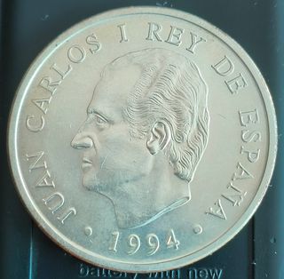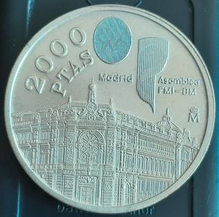 Moneda conmemorativa de 2000 pesetas de plata de 1994, emitida por España con motivo de la Asamblea del Fondo Monetario Internacional y el Banco Mundial (FMI-BM) celebrada en Madrid. Anverso: Presenta el retrato de Su Majestad el Rey Juan Carlos I, con la leyenda "JUAN CARLOS I REY DE ESPAÑA" y el año de acuñación, 1994, en la parte inferior. Reverso (como se ve en la imagen): Muestra una representación del edificio del Banco de España en Madrid. Arriba a la izquierda figura el valor facial "2000 PTAS". A la derecha se lee "Madrid" y "Asamblea FMI-BM", junto con la marca de ceca (una "M" coronada). Plata 925 mls. 18 grs. 33 mm.