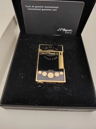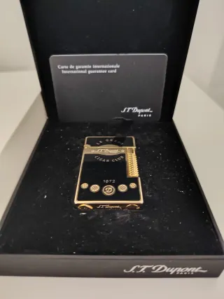 Elegante mechero ST Dupont Le Grand Cigar Club, con un diseño distintivo. - lleva número de serie. - Acabado dorado y negro. - Detalle de monedas y el año 1872. - Incluye tarjeta de garantía internacional. Se vende con su caja original Dupont, precio no negociable. No se acepta devolución excepto defecto de fábrica.