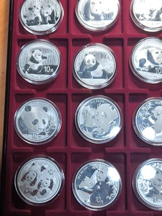 Disponible una Colección de Monedas de 1 Onza Plata PANDA sin duda una de las colecciones Clásicas y con más demanda internacional, por su bonito diseño que cambia cada año. Incluye de los años 2011 a 2025 como se puede ver en las fotos, en total 16 onzas, una por año desde 2011. Se entregan las monedas de las foto, incluye bandeja de onzas Leutchurm de 20 huecos nueva. Monedas encápsulada en fabrica para su protección y conservación. Comprobadas con el Verificador Sigma Metalytics como se puede ver en las fotos. Entrega en mano en Alcorcón, Moncloa, Collado Villalba o el domingo en la plaza mayor de Madrid.