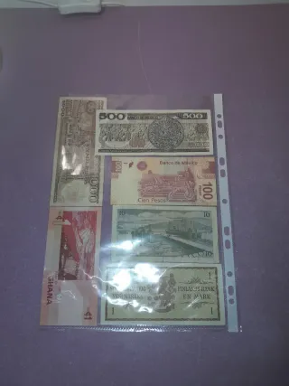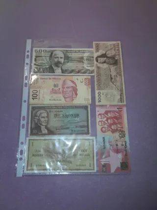 Colección de billetes de diferentes países. - Billete de 500 pesos mexicanos. - Billete de 100 pesos mexicanos. - Billete de 1000 pesos mexicanos. - Billete de 10 coronas islandesas. - Billete de 1 marka finlandesa. - Billete de 1 cedi de Ghana.