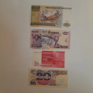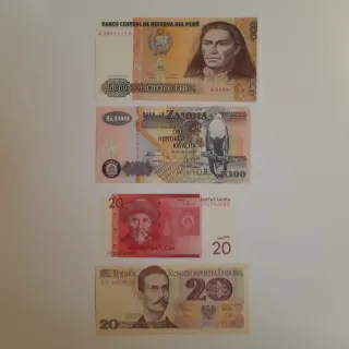 Lote 4 de billetes de diferentes países. - Billete de 500 Quetzales de Perú. - Billete de 100 Kwacha de Zambia. - Billete de 20 Som de Kirguistán. - Billete de 20 Zloty de Polonia. TODOS SON NUEVOS SIN CIRCULAR