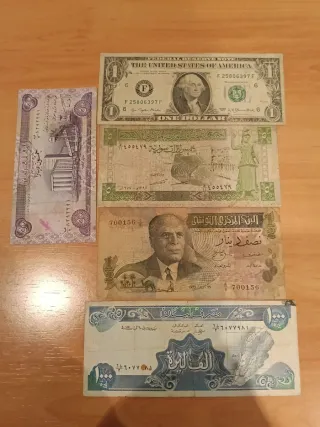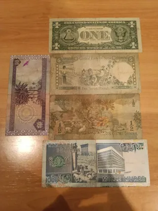 Conjunto de billetes de diferentes países. - Un billete de dólar estadounidense. - Un billete de 50 dinares iraquíes. - Un billete de 5 liras sirias. - Un billete de medio dinar tunecino. - Un billete de 1000 liras libanesas.