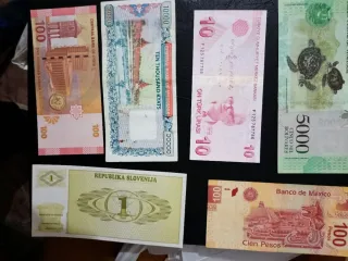 Colección de billetes de diferentes países. - Billete de 5000 Bolívares de Venezuela. - Billete de 10 Liras Turcas. - Billete de 100 Pesos de México. - Billete de 10000 Kyats de Myanmar. - Billete de 100 Liras Sirias. - Billete de 1 Kuna Eslovena.