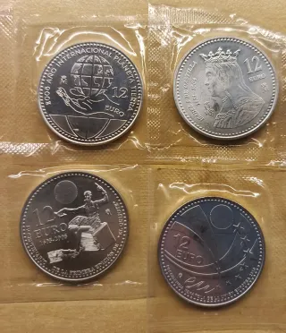 Se venden/cambian monedas de 12€ y 2000 pesetas de plata 925 de diversos años, por onzas de plata o monedas de 40€ aportando algo de diferencia. 38€/ud - Moneda Año Internacional Planeta Tierra 2008. - Moneda Isabel I de Castilla 1451-1604. - Moneda Centenario de la primera edición de El Quijote 1605-2005. - Moneda Presidencia Española Unión Europea 2010.