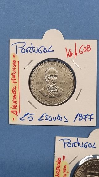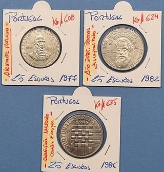 Conjunto de tres monedas de Portugal. - Moneda de 25 Escudos de 1977, conmemorativa de Alexandre Herculano. - Moneda de 25 Escudos de 1982, Año Internacional de las Personas con Discapacidad. - Moneda de 25 Escudos de 1986, conmemorativa de la entrada de Portugal en la CEE (Comunidad Económica Europea).