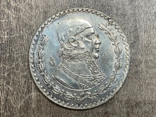 Moneda mexicana 5 Pesos 1953 “Año de Hidalgo”, acuñada en plata de ley 0,720, con peso total de 27,78 g (≈ 20 g de plata fina). Anverso con el escudo nacional mexicano, valor facial, peso y pureza marcados, y reverso con el busto de Miguel Hidalgo y Costilla junto a la iglesia de Dolores. Diseñada para conmemorar el bicentenario del natalicio de Hidalgo, es una pieza histórica muy apreciada tanto por coleccionistas de numismática mexicana como por inversores en plata.