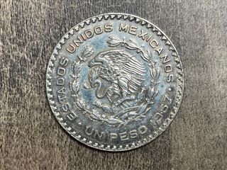 Moneda de plata con el escudo nacional de México. - Diseño del águila devorando una serpiente. - Inscripción Estados Unidos Mexicanos.