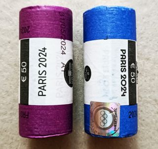 Los dos rollos juntos serian 195 Euros y por separado. Rollo 25 x 2 Euros Conmemorativo Francia 2024 París 2024 ''Torre Eiffel'' FdC, rollo azul 115 Euros. Rollo 25 x 2 Euros Conmemorativo Francia 2024 París 2024 ''Torre Eiffel'' UNC, rollo granate 90 Euros.