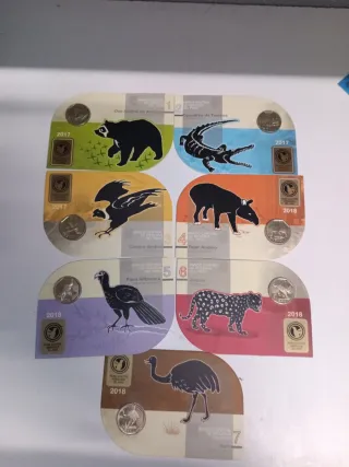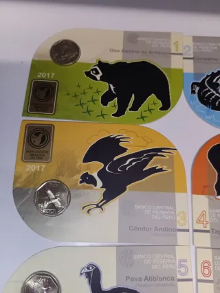 Colección de monedas de la serie Animales del Perú emitidas por el Banco Central de Reserva del Perú. - Incluye monedas de los años 2017 y 2018. - Representa diversos animales de la fauna peruana. - Cada moneda está presentada en su empaque individual con la imagen del animal.