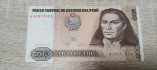 Billete de 500 intis peruanos, emitido en 1987. - Banco Central de Reserva del Perú. - Serie A 4302353 N. - Fecha de emisión: 26 de junio de 1987. - Ilustra a José Gabriel Condorcanqui.