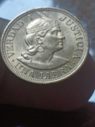 Moneda peruana con la inscripción Un Sol. - Diseño con figura sentada. - Inscripción Firme y Feliz por la Unión.