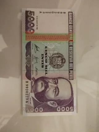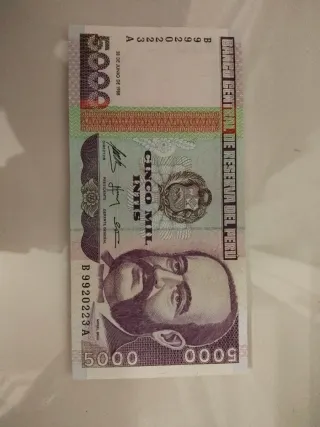Billete de 5000 Intis Peruanos del año 1988. - Serie B 9920223 A. - Fecha de emisión: 28 de junio de 1988. - Banco Central de Reserva del Perú.