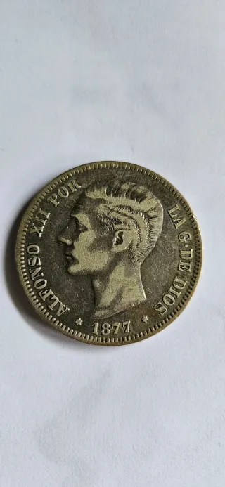 Moneda de 5 pesetas con la efigie de Alfonso XII, acuñada en el año 1877. - Material: Plata. - Canto con inscripción LA S. IGLESIA DE DIOS NOS AMPARE y ALFONSO XII POR LA S. IGLESIA DE DIOS. - Año: 1877.