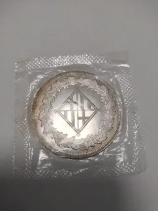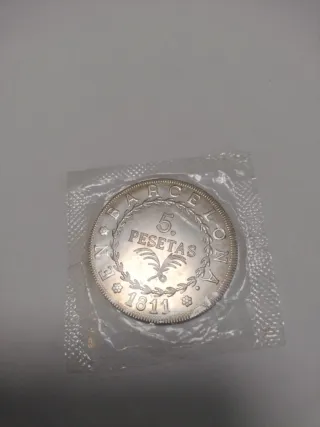 Moneda de plata conmemorativa de Barcelona. - Valor: 5 Pesetas. - Año: 1811. - Diseño: Incluye un gallo y laureles.