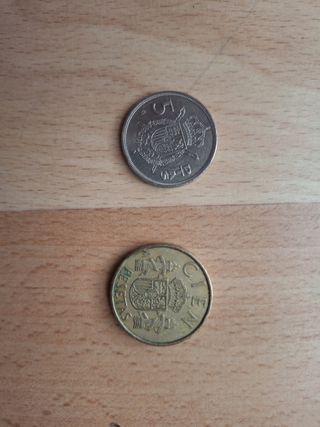 Una moneda de 100 pesetas de 1983 y una moneda de 5 pesetas de 1984.