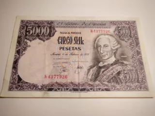 Billete de 5000 pesetas de España, con la efigie de Carlos III. - Emisión del Banco de España. - Fecha: Madrid, 6 de febrero de 1976. - Serie K4377926.
