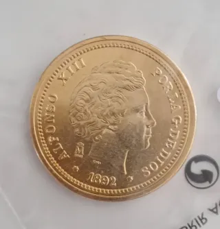 Más monedas en mi perfil, se hacen lotes, preguntar precio. Réplica de moneda conmemorativa de Alfonso XIII. - Año: 1892 - Denominación: 20 Pesetas - Diseño: Retrato de Alfonso XIII y escudo. - Material: Metal dorado.