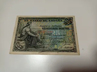 Billete de 25 pesetas del Banco de España con fecha de 24 de septiembre de 1906. - Pagadero al portador. - Emitido en Madrid. - Firma del Gobernador y Cajero. - Impreso por Bradbury Wilkinson & Co. Londres.