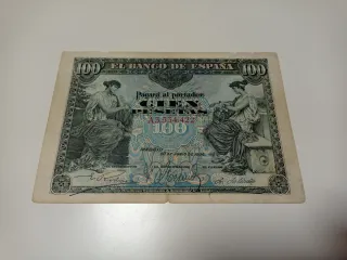 Billete antiguo del Banco de España con valor de 100 pesetas, emitido en Madrid el 30 de junio de 1906. - Diseño con figuras femeninas alegóricas. - Serie A3, número de serie 554422. - Firmas de El Interventor, El Gobernador y El Cajero. - Impreso por Waterlow & Sons, Limited, London.