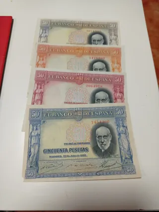Lote de cuatro billetes de 50 pesetas del Banco de España. Alterados químicamente - Billetes de diferentes series y números de serie. - Diseño con retrato de personaje histórico y alegorías. - Texto en español, incluyendo Cincuenta Pesetas.